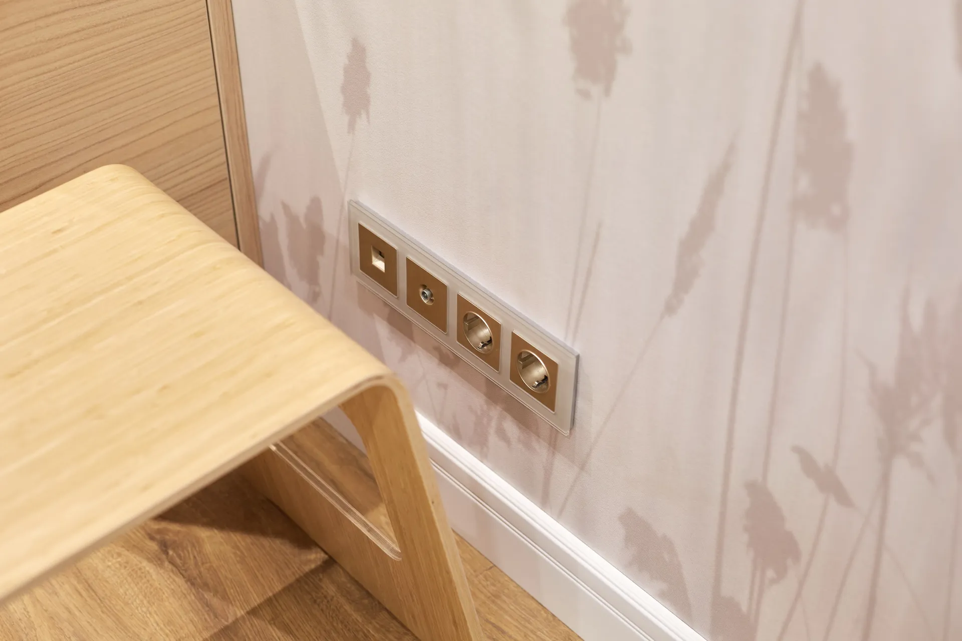 Гармоничным завершением интерьера стали электроустановочные изделия Werkel™. Эффектные механизмы с лицевыми панелями в благородном цвете шампань рифленый обрамлены элегантными рамками из закаленного стекла серии Favorit. Имитация шлифованного металла создает мягкие переливы на свету, добавляя интерьеру изысканности, а строгие стеклянные рамки подчеркивают современный стиль помещения .